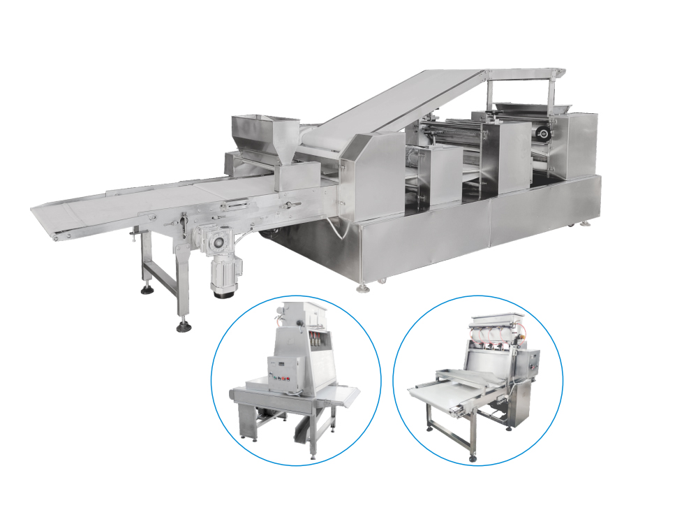 拌漿機將糖漿加熱攪拌均勻→和面→面團擠出輸送→面餅成型→一次烘烤→噴糖→二次烘烤→冷卻